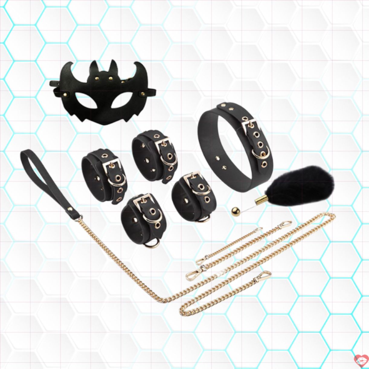 - Đặc điểm: Gồm 1 bộ nhiều món khác nhau sử dụng trong quan hệ tình dục như còng tay phụ kiện , còng chân đặt hàng , mặt nạ miễn phí , khóa cổ online , roi da đánh giá , khóa hàm hàng giả , dây khóa tay chân thống kê , nút ngậm miệng.