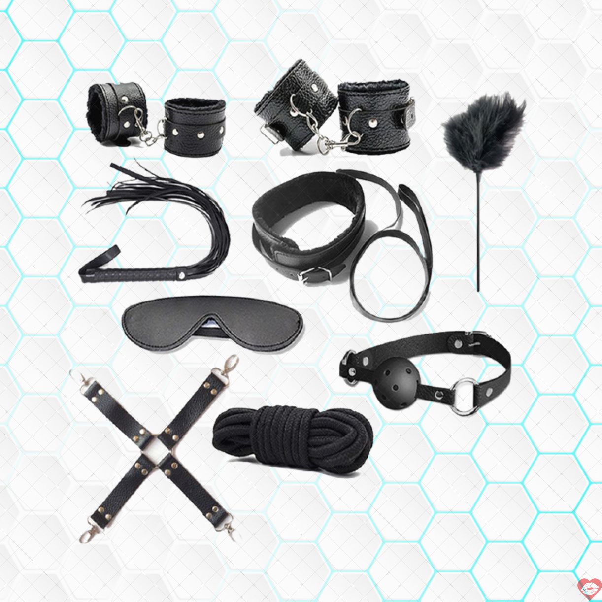 Đặc điểm: Gồm 1 bộ nhiều món khác nhau sử dụng trong quan hệ tình dục như còng tay xuất khẩu , còng chân xách tay , bịt mắt hàng nhái , khóa cổ thương hiệu , roi da danh sách , phết mông xách tay , khóa hàm hàng Hiệu , dây trói Nhật Bản , dây khóa tay chân.